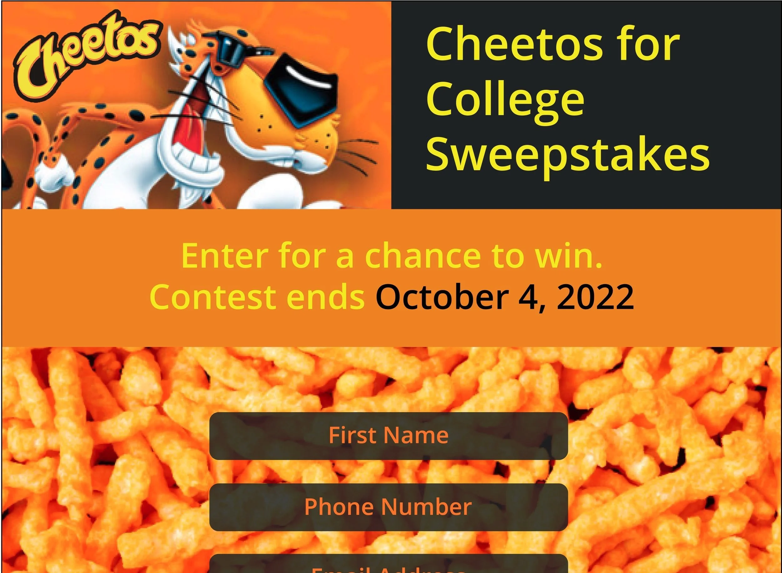 Approach: I chose to keep the tone straightforward and simple knowing that we want to create as few barriers as possible for people to enter their data for the contest. I also kept in line with the Cheetos brand of high-energy and fun with the headline and subheadline short and to-the-point while making sure all of the necessary T&Cs of the contest were included.
