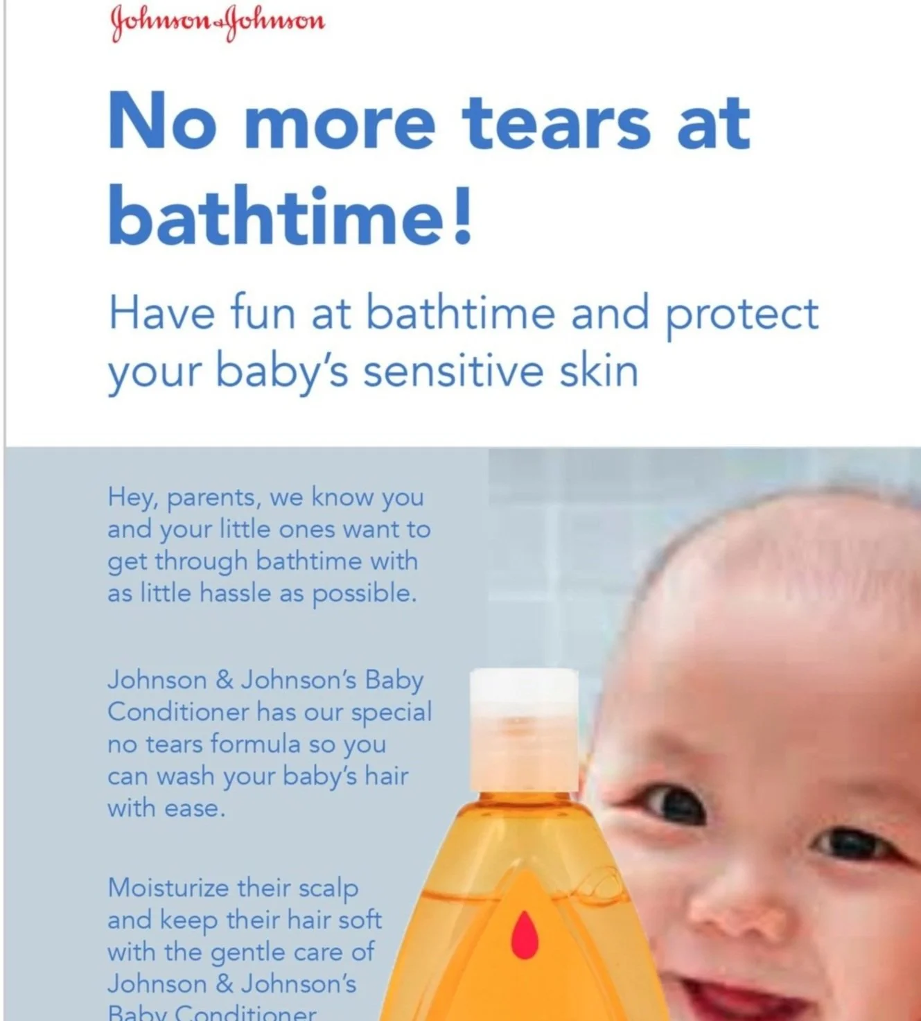Approach: The target demographic is concerned with keeping their children comfortable and finds it important to have a pleasant and easy bathtime experience. I decided to take a friendly tone and convey the benefit of hassle-free, safe and comfortable conditioner. Conveying this benefit appeals to the deeper concern many parents have that if their child has an easy bathtime experience, then they are a good parent.