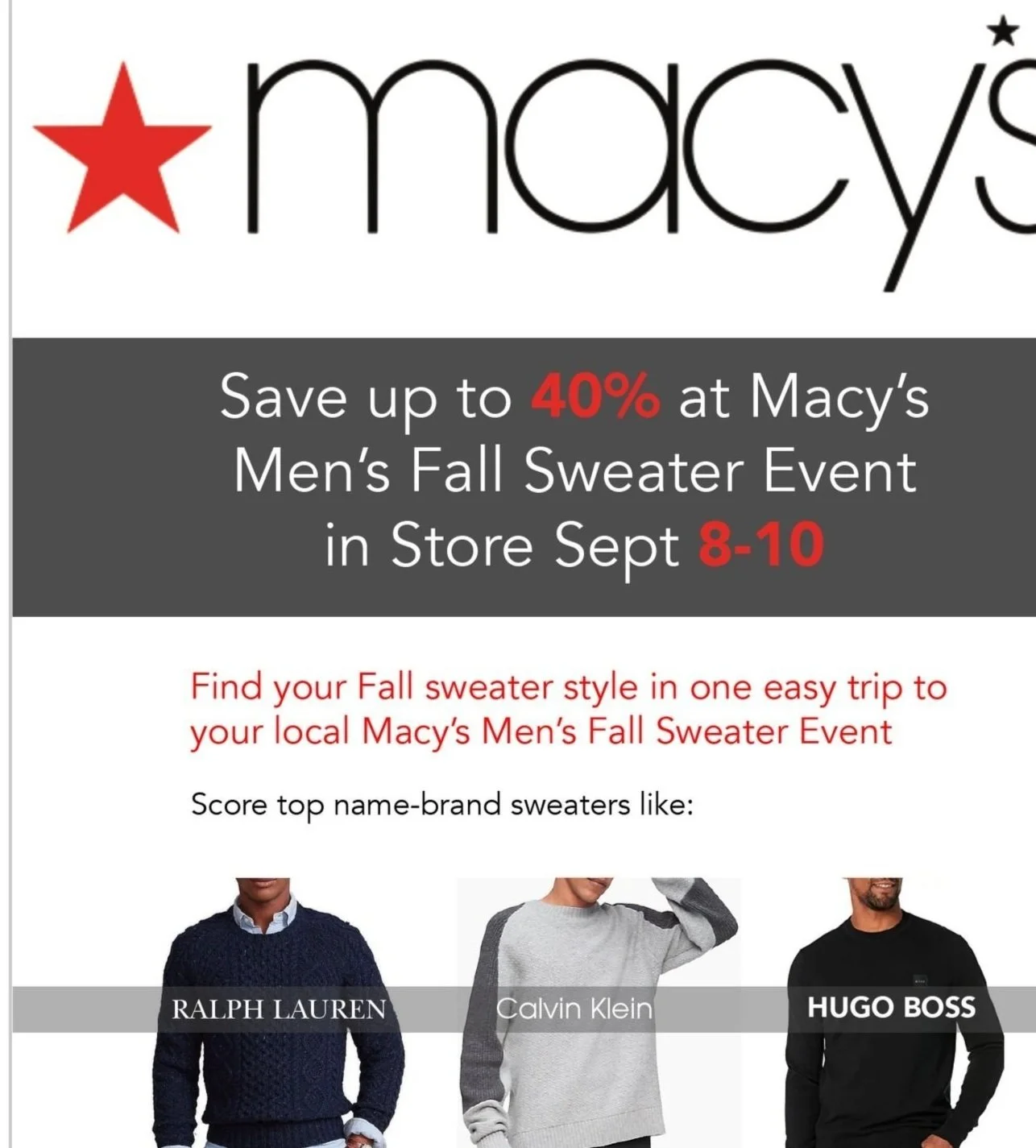 Challenge: The email is meant to increase awareness of a special sales event and drive traffic to stores for the event. The products promoted in the email may be meant for adult men but the email must also appeal to women because data shows that women often purchase clothes for the men in their lives.